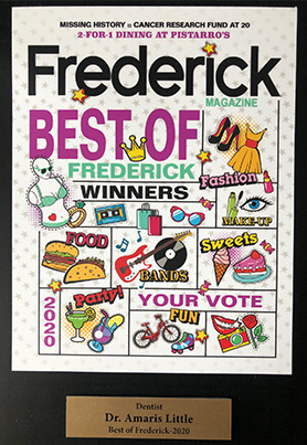 Dr. Little completed her Doctor of Dental Surgery at the University of Maryland School of Dentistry in 2003. She is a member of the American Dental Association, Maryland State Dental Association, Frederick County Dental Association, Rotary Club of Frederick, Board of Trustees and Grant Chair The Community Foundation of Frederick County. She has been Voted Best Dentist 2019 Best of Frederick, Best Dentist 2020 Best of Frederick, 2019 Frederick News Post Best of the Best Dental Office Finalist and Best Dentist.